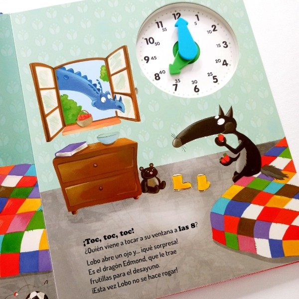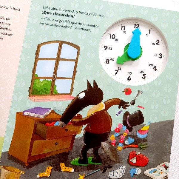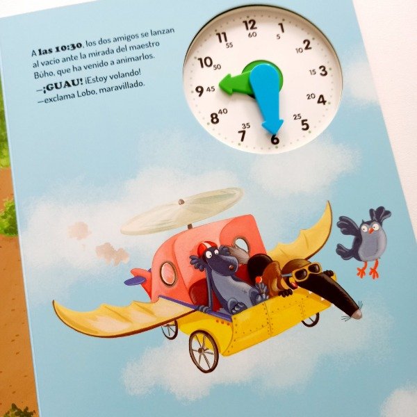 ¡Riiing! Son las 7 de la mañana. Lobo remolonea un poco, ¡hasta que recuerda que quedó en encontrarse con Valentín a las 10! Sigue a Lobo en sus aventuras y aprende a marcar y leer la hora girando las agujas del reloj incluido en el libro.