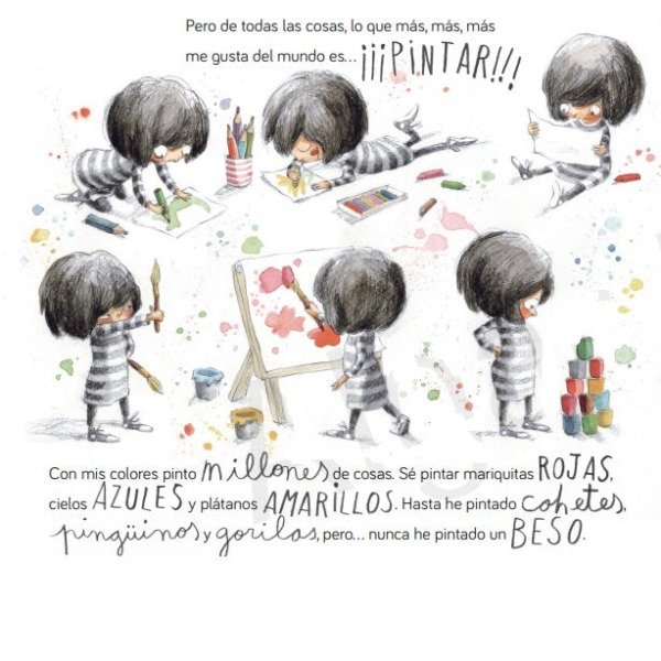 A Minimoni le encanta pintar mil cosas de colores: mariquitas rojas, cielos azules, plátanos amarillos... pero nunca ha pintado un beso.