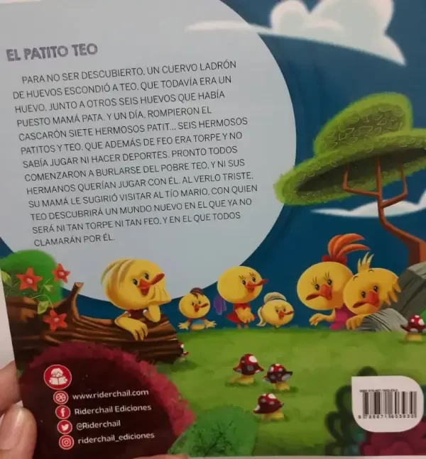 Para no ser descubierto, un cuervo ladrón de huevos escondió a Teo, que todavía era un huevo, junto a otros seis huevos que había puesto mamá pata. Y un día, rompieron el cascarón siete hermosos patit… seis hermosos patitos y Teo, que además de feo era torpe y no sabía jugar ni hacer deportes. Pronto todos comenzaron a burlarse del pobre Teo, y ni sus hermanos querían jugar con él. Al verlo triste, su mamá le sugirió visitar al tío Mario, con quien Teo descubrirá un mundo nuevo en el que ya no será ni tan torpe ni tan feo, y en el que todos clamarán por él.